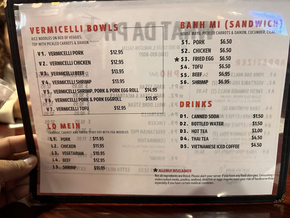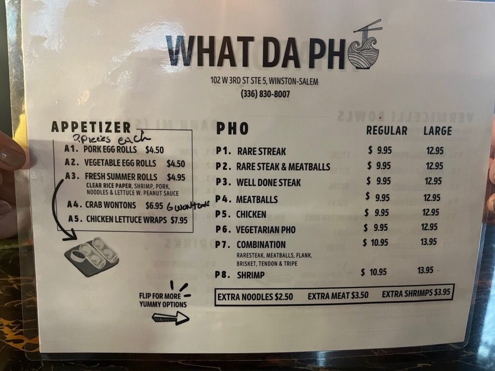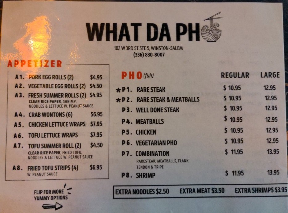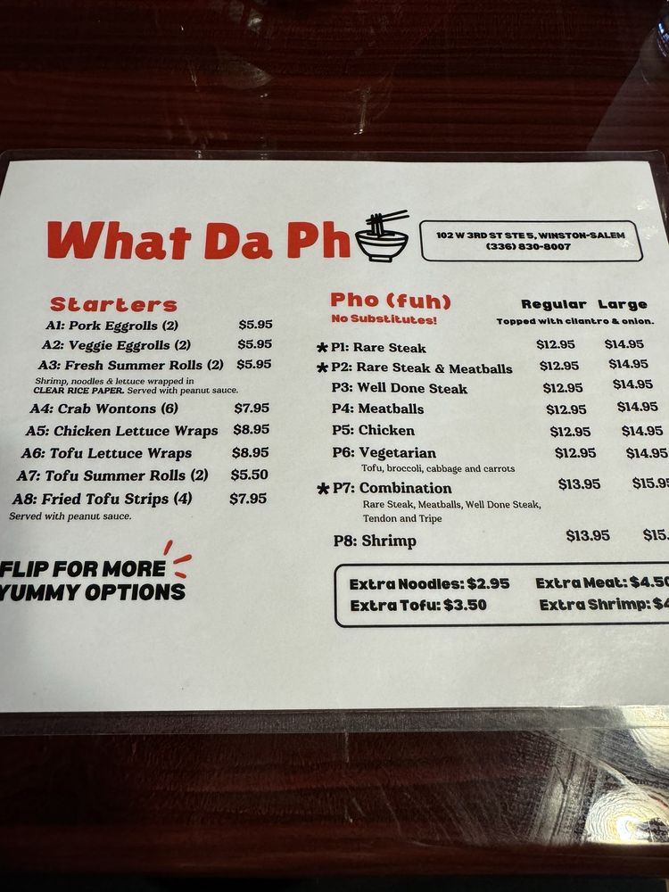 What Da Pho, located in Winston-Salem, NC, offers a delightful Asian Fusion experience with a focus on Vietnamese cuisine. Known for their delicious pho, bahn mi sandwiches, and flavorful appetizers, this family-run establishment has won the hearts of many patrons. Customers rave about the quality and freshness of the dishes, highlighting the marinated chicken in the bahn mi and the sensational broth in the pho. The accommodating staff, cozy ambiance, and affordable prices make What Da Pho a must-visit for lovers of Vietnamese food. With options for customization and a variety of meat and vegetarian choices, this restaurant caters to a diverse range of tastes. Don't miss out on trying their crab rangoons, crispy tofu bahn mi, and refreshing Thai iced tea. A hidden gem worth discovering for a satisfying dining experience.